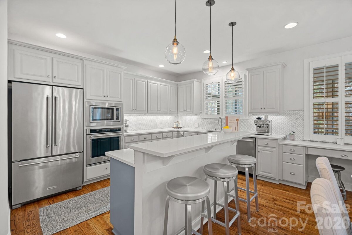 Stunning renovated home in the sought-after Ballantyne area neighborhood of Allyson Park. This beautifully updated and meticulously maintained home offers exceptional style, comfort, and functionality. Featuring numerous recent updates—including refinished hardwood floors, a fully renovated kitchen, updated great room, stunning primary bath, refreshed main-level bath, and new carpet on the upper levels—this pristine property truly shows like a model home. The gorgeous chef’s kitchen has been thoughtfully redesigned with crisp light cabinets, quartz countertops, a custom backsplash, KitchenAid appliances, updated lighting, and a spacious work island. Additional highlights include a separate butler’s pantry/bar area and a large walk-in pantry, providing both convenience and elegant entertaining space. The great room overlooks the private backyard and features a striking fireplace with stacked stone surround and dramatic wood detail above the mantle, creating a warm and inviting focal point. Formal living and dining rooms offer ideal spaces for entertaining, while a guest bedroom/private study with a full bath completes the main level. Upstairs, the luxurious primary suite offers a tray ceiling, a comfortable sitting area, and a versatile flex space perfect for a home office, gym, or additional closet space. The spa-like primary bath is exceptional, showcasing an oversized shower, soaking tub, dual-sink vanity with designer lighting, and access to a large walk-in closet with custom built-ins. The second level also features a private guest suite with an en-suite bath and walk-in closet, plus two additional bedrooms connected by a Jack-and-Jill bath. The third floor provides incredible versatility with space ideal for a media room, game room, or children’s playroom. Outdoor living is equally impressive with a large screened porch featuring tile flooring and EZE-Breeze windows, creating a peaceful space to relax nearly year-round. The spacious fenced backyard includes a patio with a gas fire pit and plenty of room for children and pets to play. A side-load 3 car garage provides additional storage space. Residents of Allyson Park enjoy wonderful neighborhood amenities including a pool, playground, and tennis/pickleball courts. Ideally located in the highly desirable Ballantyne area with easy access to I-485 and just minutes to the Ballantyne Bowl, Stonecrest and Blakeney areas for all your shopping and dining needs plus top-rated schools, this exceptional home truly has it all!