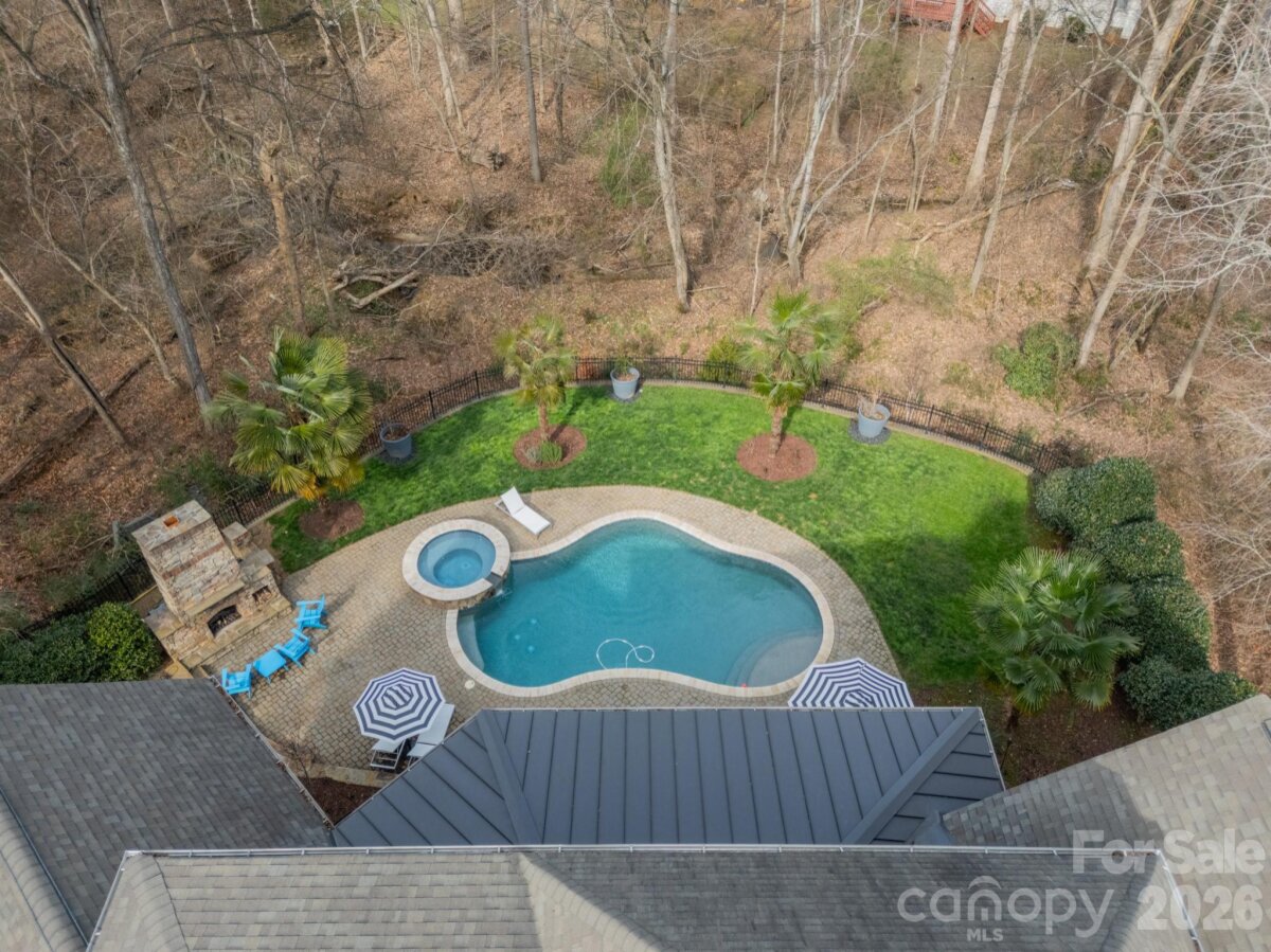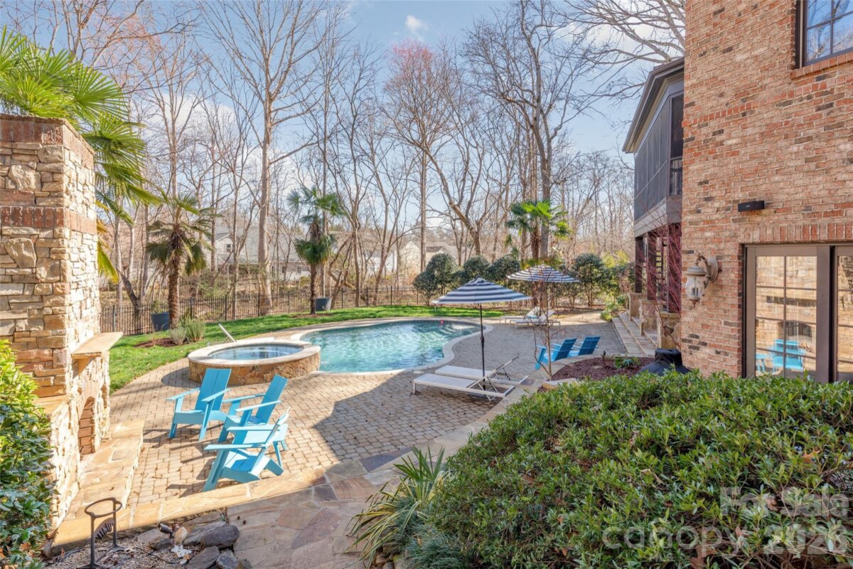 Beautiful Highgrove community in south Charlotte NC - this incredible custom basement home with outdoor pool offers the ultimate in location and living space. Highgrove features sidewalks and a community park space where you may enjoy relaxing and playing. So much shopping within a few minutes along with restaurants and other daily living resources. Schools are across the street making this a super convenient community, if you choose those options. Living in this amazing home offers two floors with a large primary suite on the main level, with multiple ensuite beds/baths on the upper second level. You will find additional bed/bath space also in the finished basement level. So many options for how you want to live in the home. Beautifully finished with custom moldings and cabinetry throughout the home. Main living space features an open concept with views of the upper huge screened porch overlooking the fenced rear yard and in-ground pool and hot tub. Meal time is a joy with this amazing chef's kitchen with Thermidor and Sub Zero appliances and a gas/griddle cooktop. And in warmer months, the outdoor grill or Egg offer additional cooking choices. Parties and casual gatherings are so convenient with the kitchen and large great room spaces in the finished basement. Tons of windows bring in natural light into the main basement space with view of the outdoor covered terrace with a view of the pool. Enjoy evenings with the gas outdoor fireplace. In the spring/summer/fall, the trees create a hidden oasis in the rear yard that is enchanting. The yard feels even larger with community open space along the rear side yard. interior finishes include real wood flooring, tiled baths and beautiful lighting. Two instant hot water heaters support relaxing showers. Workouts are so easy with your own gym in the basement. Tons of storage and workshop space too! So much to love about this property and community!! Owners are sad to be relocating from this amazing home, so come take a look for yourself and fall in love with this property too.