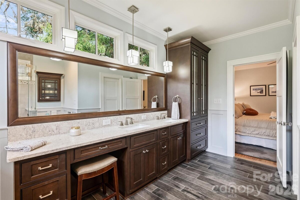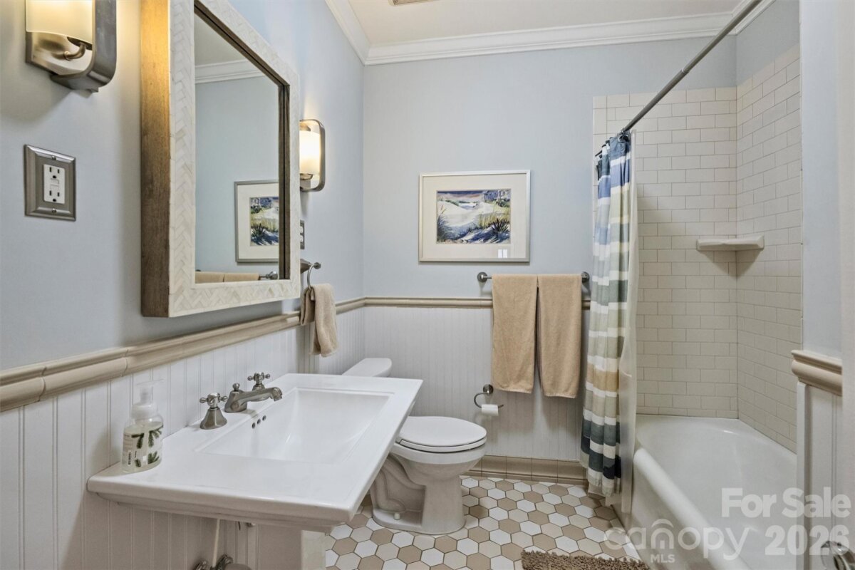 Opportunity to live on a premier street in Historic Dilworth. This charming 1.5 story, four bedroom, 1924 bungalow home on Dilworth Road East welcomes you with a sidewalk lined street and a covered front porch perfect for greeting neighbors. Step inside to 9 foot ceilings that create an immediate sense of openness. The living room, anchored by a cozy gas fireplace, is ideal for entertaining guests. A separate den with built-in shelves offers a comfortable space to relax. Down the hall, the primary suite on the main level features a spacious, remodeled bathroom and a walk-in closet. A second bedroom and full bath are also located on the main floor. The large kitchen with newer windows continues with the hardwood floors found throughout and opens to a cozy breakfast room overlooking the backyard. The laundry room is conveniently located just off the kitchen and includes a washer and dryer. The dining room, complete with a charming built-in cabinet, is perfectly positioned between the kitchen and living room. Newer blinds in the kitchen, dining room, and living room. Upstairs, a large flex space provides the perfect setting for a home office, gym, or playroom. Two additional bedrooms with storage share a full bath. Outside, the fully fenced, professionally landscaped backyard features a covered outdoor living space with a wood burning fireplace, creating a wonderful setting to relax while watching your favorite show on the conveyed TV. Low maintenance turf in the backyard enhances the outdoor space. The backyard landscaping and front yard has an irrigation system. The garage offers additional storage for bikes and more.